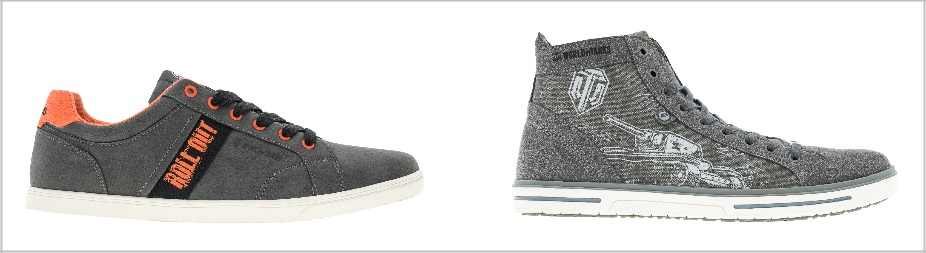 «Танкисты» и «моряки» теперь могут обуться в кеды, кроссовки и полуботинки, в дизайне которых использованы различные камуфляжные принты, а также логотипы любимых игр.