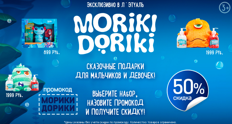 А до 15 марта все наборы можно купить со скидкой 50%. Для участия в акции вам нужно всего лишь выбрать один или несколько наборов из представленной линейки Л’Этуаль в магазине или на сайте и назвать секретный промокод «МОРИКИ ДОРИКИ».