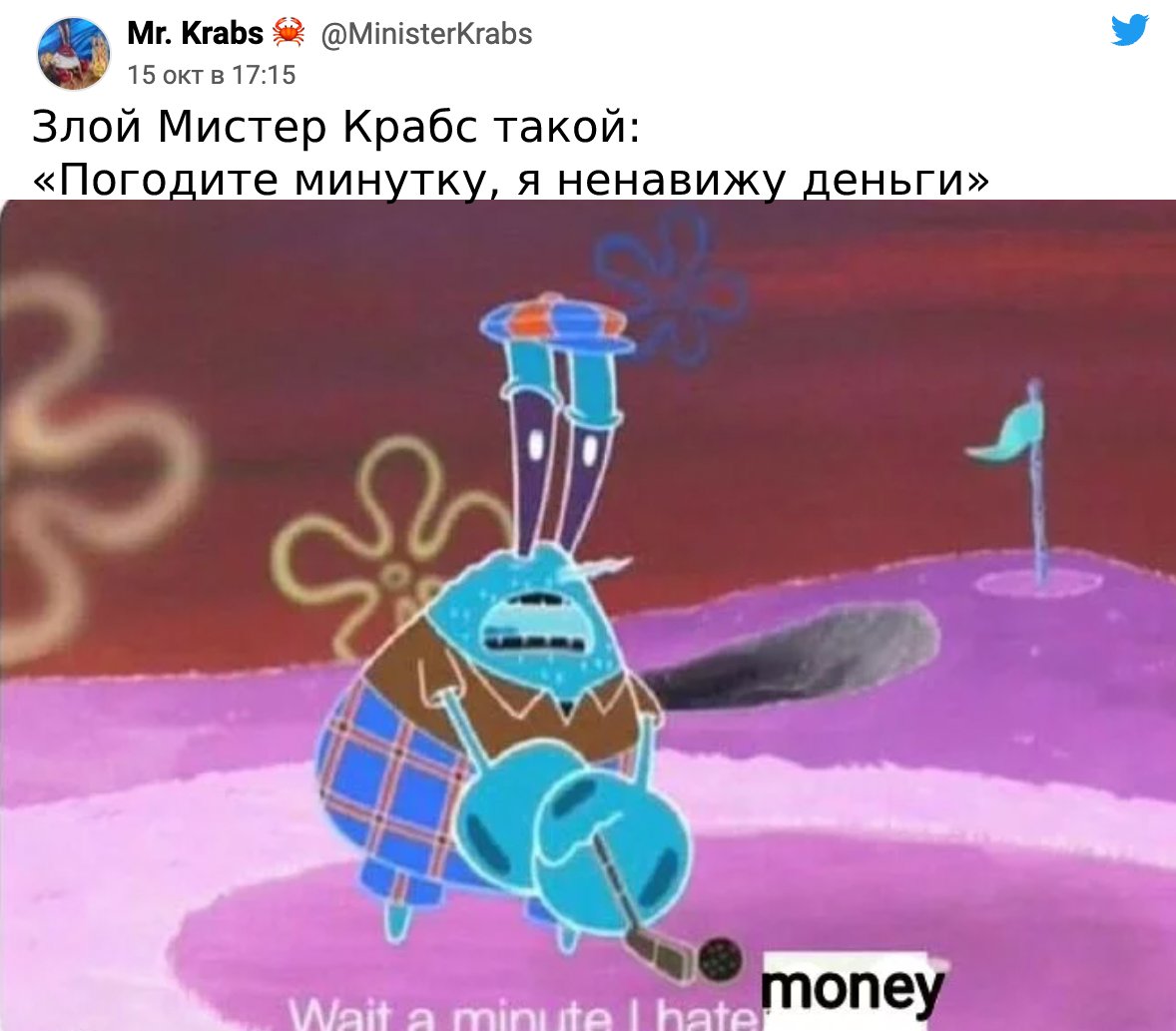 Суть мема: представьте, что бы сказала злая версия вашего любимого персонажа (да, даже если он уже злой!). У Крабса это, как всем давно понятно, тема денег.