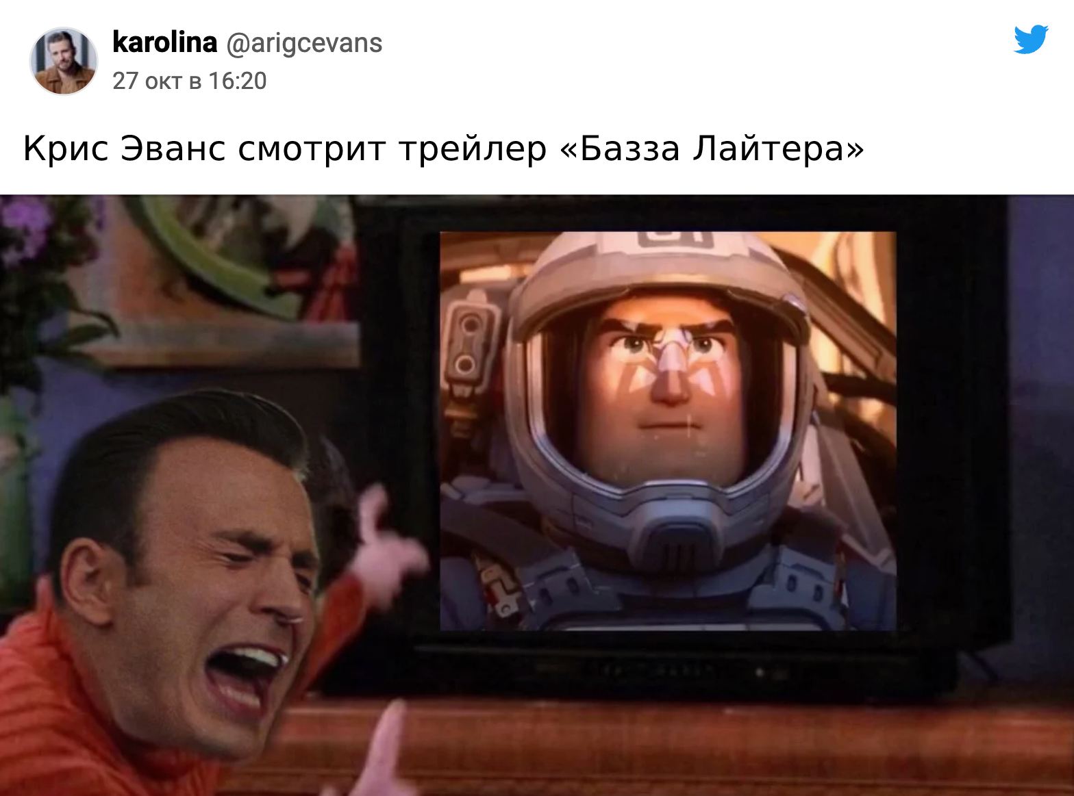 Суть мема: в будущем сольнике о настоящем Баззе Лайтере героя озвучил Крис Эванс (тот, который Капитан Америка), и после выхода первого тизера фанаты оценили работу аниматоров, а заодно скрестили реальность и вымысел, представив, как актёры озвучки ждут проекты. Кадр взят из сериала «Друзья»!