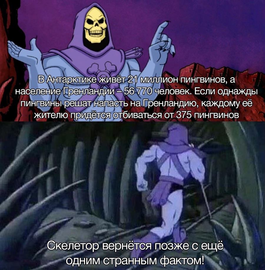 Суть мема: злодей олдскульного мультсериала «Властелины вселенной» Скелетон вынужденно сообщает неожиданные, неприятные, а порой и тревожные факты, в основном связанные со статистикой, а уже реже с такими явлениями нашей жизни, о которых и думать не хочется (к примеру, у опухолей в теле могут вырастать собственные зубы и волосы, бр-р).