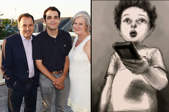 Слева — Рон Саскинд, его сын Оуэн и его жена Корнелия, справа — кадр фильма «Анимированная жизнь».