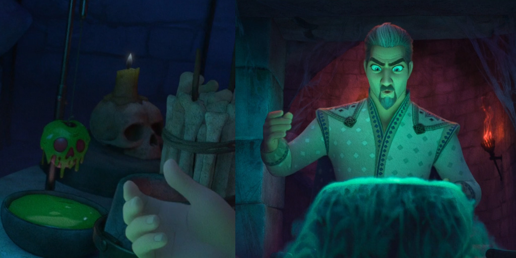 Если вам вдруг с самого начала мультфильма было не слишком очевидно, что Магнифико — злодей, можно обратить внимание на пасхалки, которые на это намекают. С этим персонажем вообще связано много отсылок — одну мы разобрали в шестом пункте, а что насчёт остальных? Магнифико часто называют волшебником, и в начале ленты Аша проходит собеседование, чтобы стать ученицей чародея, как в «Фантазии». Когда злодей использует тёмную магию, на его столе можно заметить отравленное яблоко из «Белоснежки» (и ещё он произносит «Зеркало-Зеркало»), а его силы проявляются в виде зелёного тумана, отсылающего на Малефисенту из «Спящей красавицы».