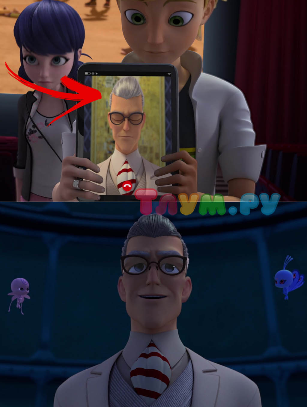 В эпизоде «Королева Бананов» герои общаются с Агрестом-старшим по видеосвязи. Когда Хлоя всё ещё находится в кинотеатре, можно увидеть Габриэля в столовой рядом с портретом жены. После ухода девушки промелькнуло всего несколько секунд, а он уже стоит в логове Бражника. Либо злодей освоил телепортацию, либо имеет место ляп. Что думаете?