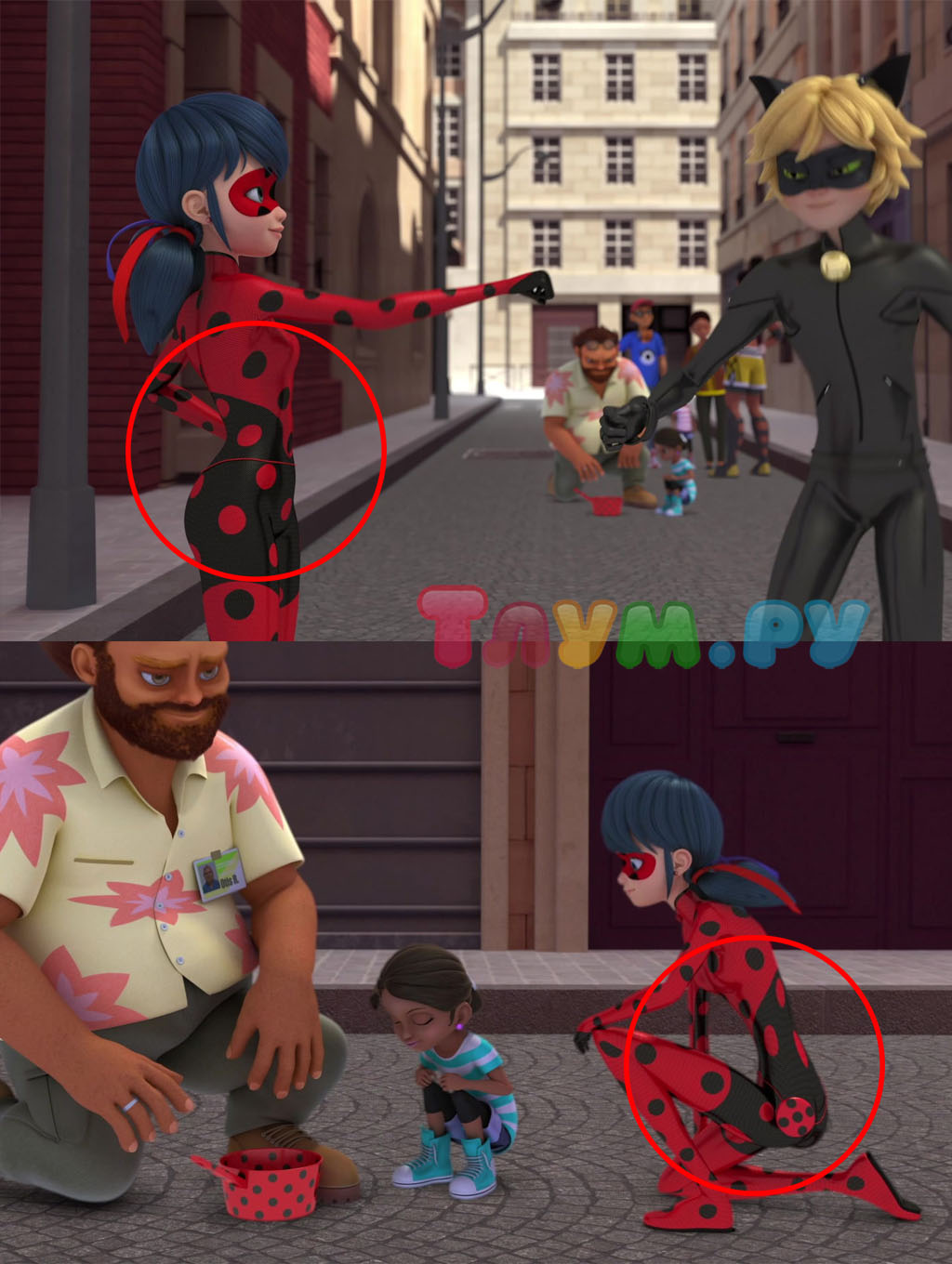 Пока мир потихоньку отказывается от неестественных стандартов внешности, Леди Баг, кажется, хочет стать моделью. Иначе как объяснить её мгновенное похудение в серии «Сентипузырь»? Вот она разговаривает с Супер-Котом и выглядит совершенно нормально, но уже в следующей сцене… остаётся только вопрошать, куда делись её внутренние органы.