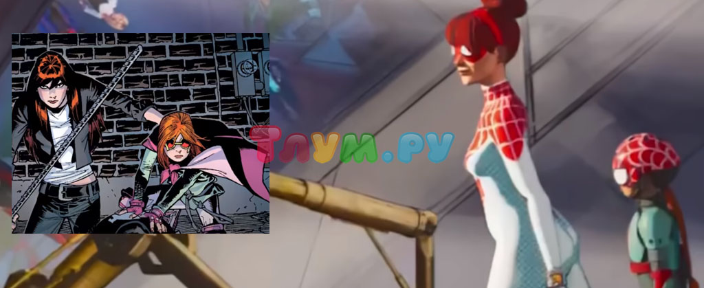 Как мы уже сказали, у Питера получилось воссоединиться с семьёй, его маленькая Паучиха пока явно не готова к геройствам, зато… ЭмДжей и Анна Мэй Паркер — мать и дочь — Спиннерет и Спайдерлинг направляются куда-то по своим делам. Это комиксный канон, вот только где персонально их Питер — вопросики. И в комиксах дамы, конечно, занимались супергеройствами, они с Земли 18 119.