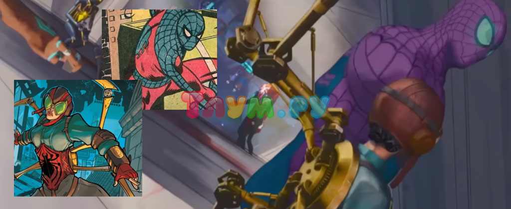 Среди разнообразия пауков удалось разглядеть интересую парочку — Мэйбелл Рейлли, она же Леди-Паук с Земли 803. Как таковых способностей у неё нет, зато инженерный ум в наличии, вот и получается некий стимпанк на спине, да не только на спине. Родная вселенная этой Паучихи пропитана стимпанком. Рядом с ней идёт Человек-Паутина, созданный некогда доктором Думом. Он является «перевёрнутой версией» Питера, начиная от костюма, и заканчивая намерениями. Поговаривают, интеллектом этот персонаж не отличался.