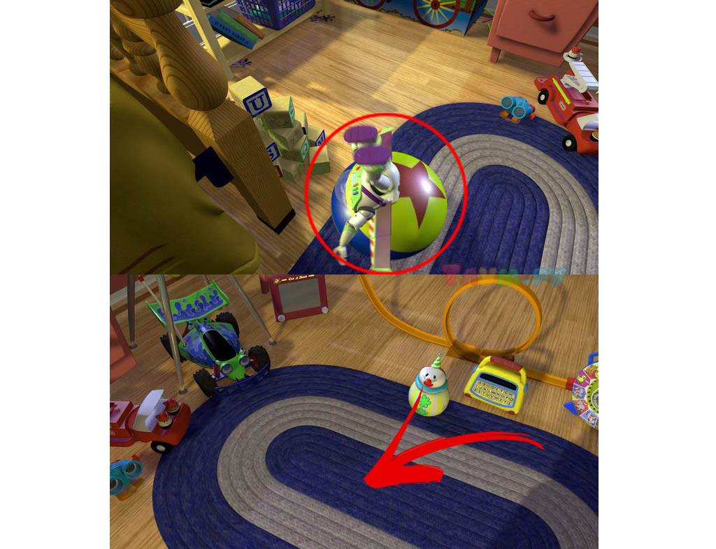 В мире игрушек нет ничего постоянного, и многие предметы часто пропадают и появляются. Как, например, этот мяч. Вот Базз готовится к «шагу в бесконечность» и мяча под ним нет, а вот он падает, и мяч таинственным образом появляется прямо под ним. Просто чудо какое-то! Кстати, этот самый мячик появляется почти в каждом мультфильме студии Pixar.