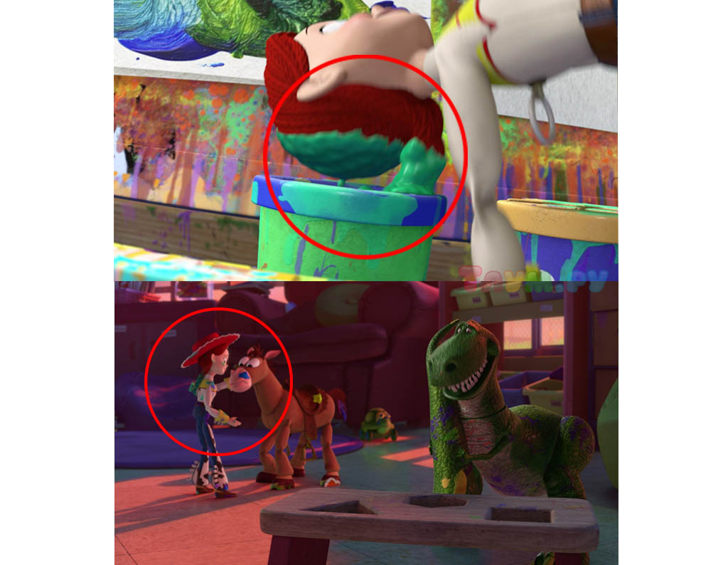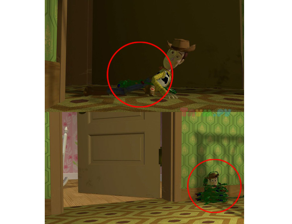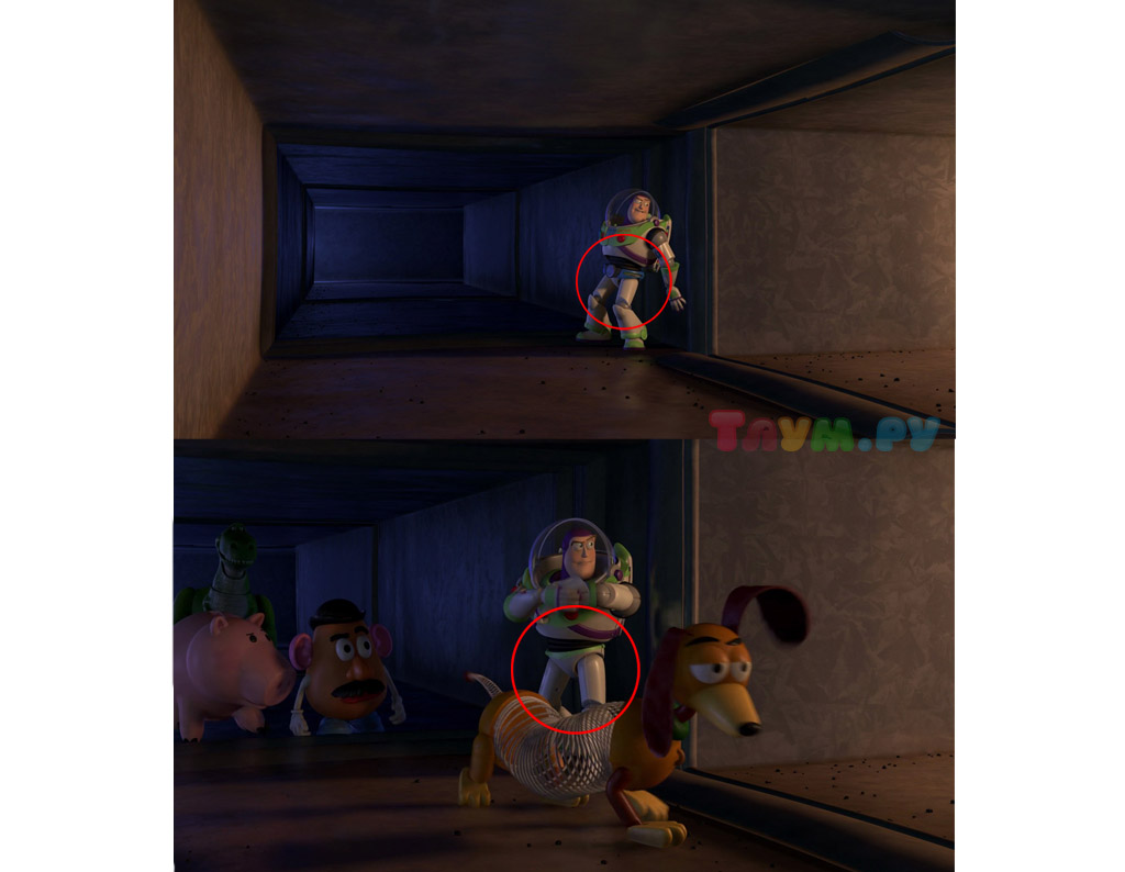 Тенденция самых разнообразных предметов неожиданно исчезать для мультфильмов не в новинку. Так, ремень Базза Светика явно живёт своей жизнью: вот он на хозяине, а через секунду уже отправился куда-то по своим делам.