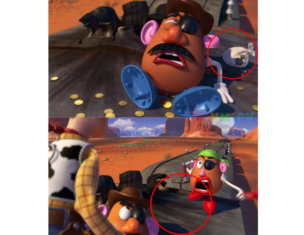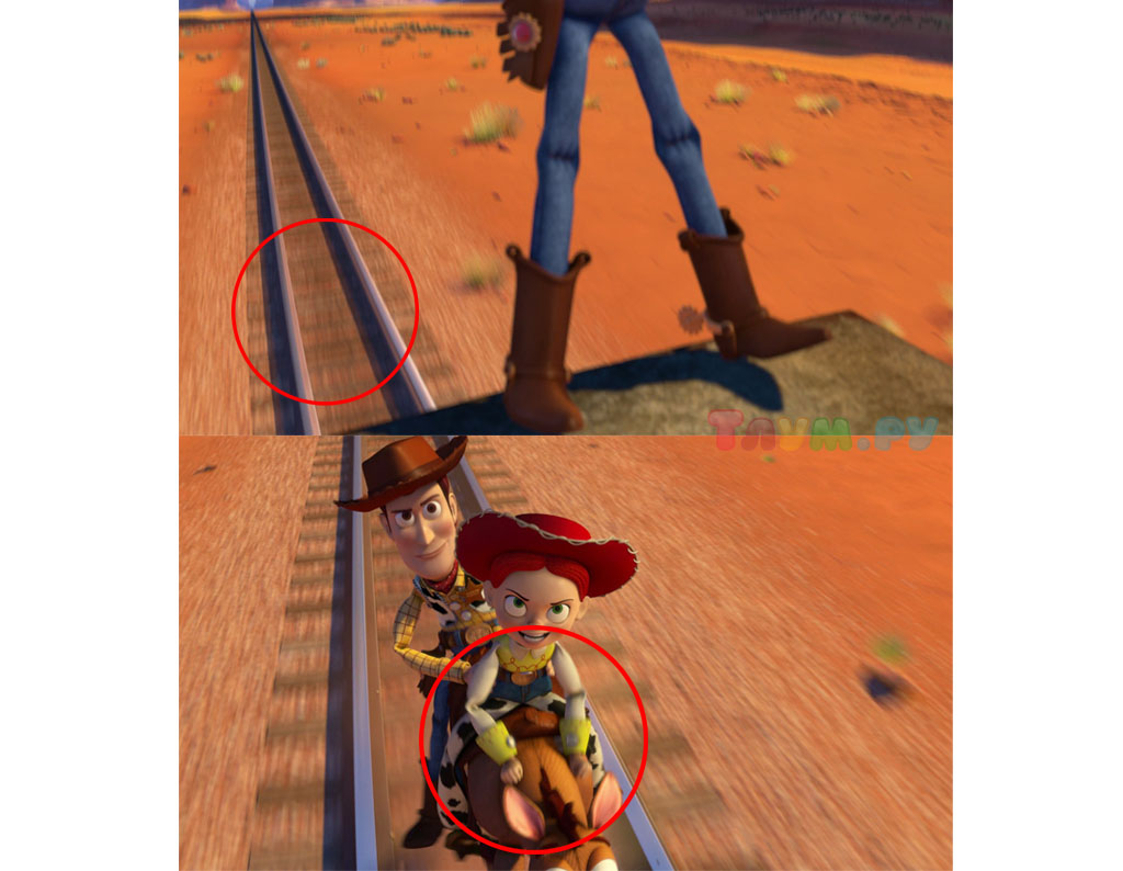 В следующем моменте Мистер Картофельная Голова сбрасывает Вуди с поезда — и тут можно заметить, что вся железная дорога за ним пустая, да и по бокам никого нет. Но тут неожиданно появляется Джесси верхом на Буллзае. Из-под земли они что ли выросли?