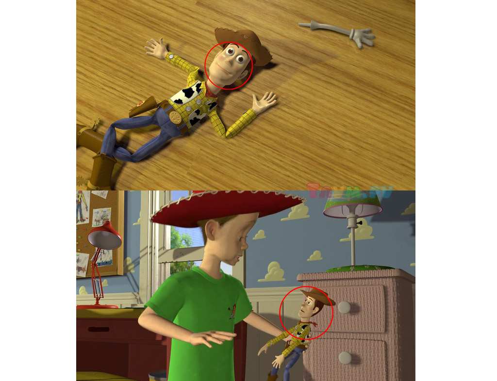 Когда Вуди закрасили надпись на подошве обуви, можно было заметить, что имя Энди написано начиная с носка и до пятки. В дальнейшем, когда ковбой сотрёт краску, можно увидеть, что надпись изменила своё положение, и теперь начинается от каблука и идёт к носку. Очевидный ляп!