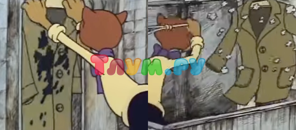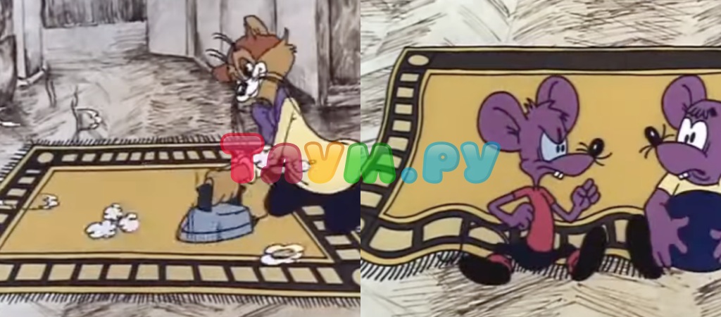 У кого «Том и Джерри», а у кого истории с меньшим уровнем агрессии. Всего-то две мыши, регулярно пытающиеся устроить Леопольду вредность. Получается у них через раз, а то и через два — чаще всего вредят они лишь себе. В эпизоде, связанном с днём рождения кота, аниматоры допустили несколько неточностей. Первая связана с типичным атрибутом советской жизни — ковром. Сперва у него есть бахрома, она отчётливо видна во время попыток кота высушить имущество. Стоит появиться мышам, как бахрома пропадает, да и рисунок начинает несколько «сбоить», видите?