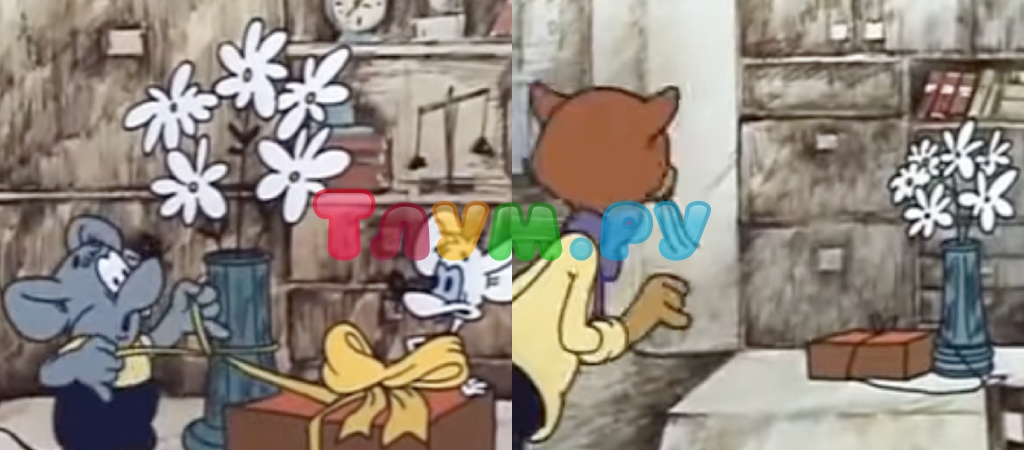 Ещё одна ошибка — это трансформация банта на коробке с отсутствующим подарком. Мыши не настолько просты, чтобы от чистого сердца проявлять к коту внимание. Оно и понятно, только куда делся бантик? О том, как в этом эпизоде себя ведут обычные цветы, и вовсе не будем говорить — пусть каждый проверит самостоятельно. Придётся считать!