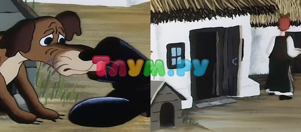 Щас мы вам споём… о целых двух ляпах в душевном мультфильме. Первый — исчезающая обувка, которую нерадивый хозяин бодро швырнул в пса. Вот сапог на месте, а вот кадр сменяется, во двор выбегает хозяйка и нет никакого сапога. Куда телепортировался? Кстати, через несколько секунд, когда хозяин выходит на порог дома, приглядитесь к его штанцам — что-то там явно не так, периодически образуется на них навязчивая красная окантовка.