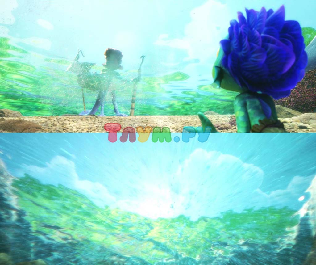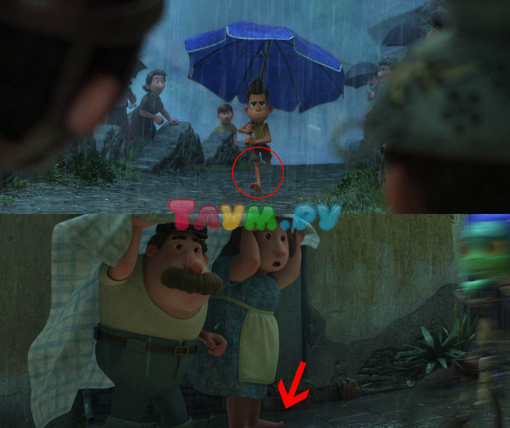 На протяжении всего мультфильма способность главных героев мгновенно трансформироваться, будучи в воде, перебивается тем, как быстро они высыхают. Вот, к примеру, Лука, пока взлетает над водой, успевает высохнуть, а при поездке с ветерком на велосипеде — нет. Насколько же жаркое там солнце?