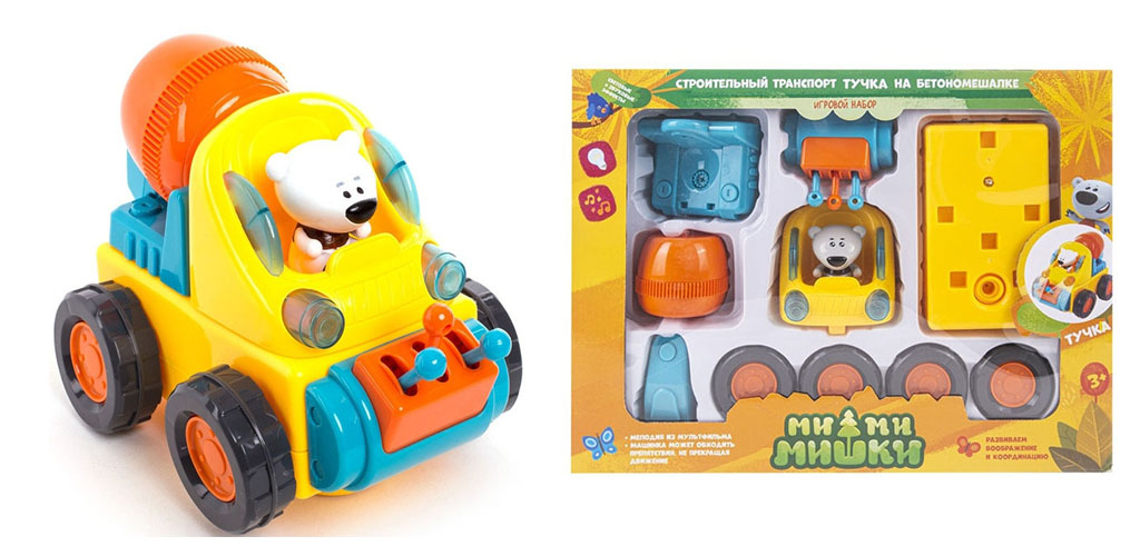 Мало того, что этот Тучка из «Ми-ми-мишек» является водителем бетономешалки и она прекрасно ездит, так её ещё и нужно сначала собрать. Полезное и приятное во всего одной упаковке с игрушкой для вашего ребёнка. Сама машинка может посветить фарами и подать звуковые сигналы. В комплекте есть несколько съёмных насадок. С таким Тучкой-строителем и его машинкой не захочется скучать.