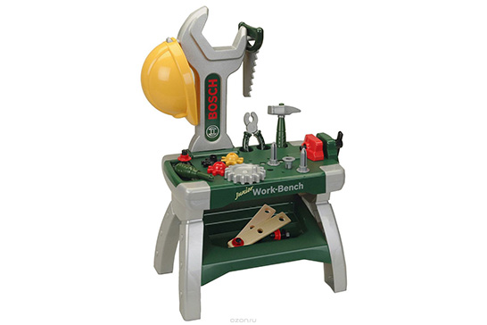 Еще один набор — игрушечный верстак с инструментами. Это отличное начало детской мастерской, в нем есть все нужное для проведение игрушечных ремонтных работ. Главное, не перепутайте эти инструменты с папиными и не забивайте ими настоящие гвозди. В комплект входит сам верстак и множество аксессуаров: 4 шестерни, 3 болта с гайками, 3 дюбеля, плоскогубцы, отвертка, молоток, пила, тиски, каска и 2 планки с отверстиями для болтов.