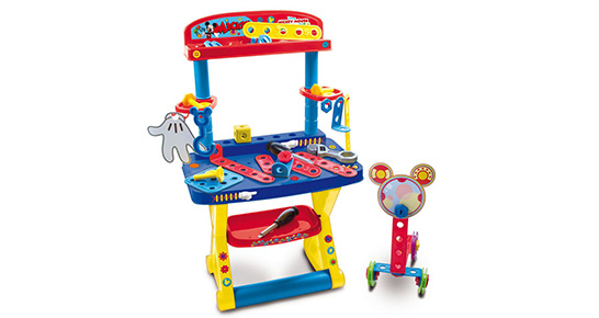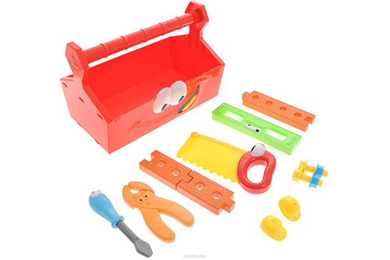 Ящик — это, конечно, маловато. Лучше уж сразу целый стол, чтобы надолго занять малыша. Ведь в этот набор входят не только инструменты, но и элементы конструктора, с помощью которых ребенок может самостоятельно собрать множество увлекательных игрушек. Тут есть и обычные инструменты: отвертки, ключи, гайки, планки. Все это имеет свое место для хранения, а значит — приучает детей к порядку.