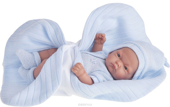 А если вашей дочке хочется повозиться с детьми поменьше — ей подойдет пупс Карлос. Кукла выполнена с анатомической точностью и выглядит как настоящий новорожденный. Сделан пупс из винила, ручки, ножки и голова у него подвижные. Это настоящая копия младенца, которая вызывает желание позаботиться о нем, покачать на ручках и прижать к себе. Такие игрушки учат детей проявлять доброту и внимание, особенно если в вашей семье скоро и правда появится новый малыш.