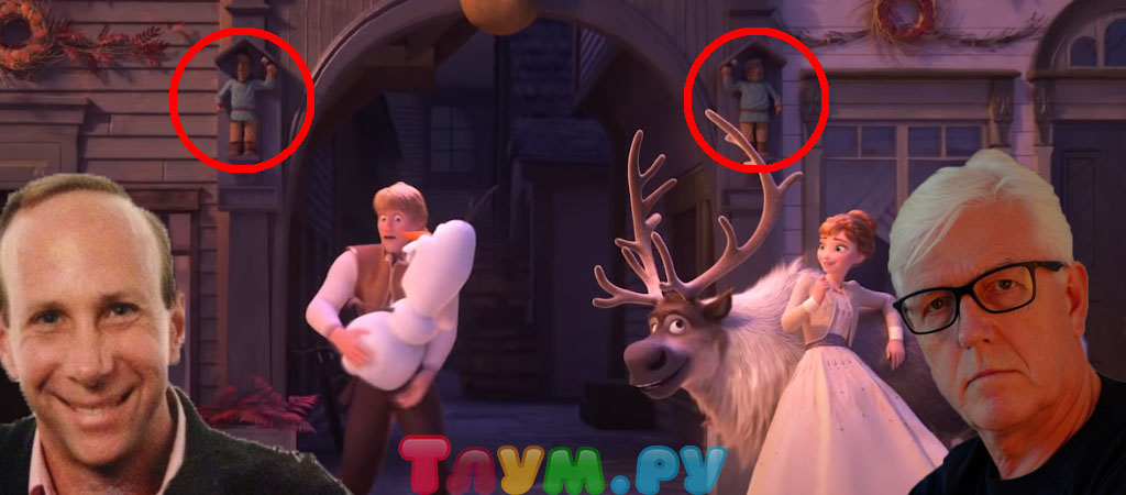 И раз уж Эльзу увековечили на золотых монетах королевства, то почему бы и создателям мультфильма не «запечатлеться» где-то навсегда? В одной из сцен холодного сиквела на фоне наблюдаются две непохожие (по лицам) фигурки, застывшие в зеркальной позе. Это не просто так — слева представлен Майкл Джиаймо, а справа Дэвид Вомерсли. Оба работали в качестве художников над созданием «Холодного сердца».