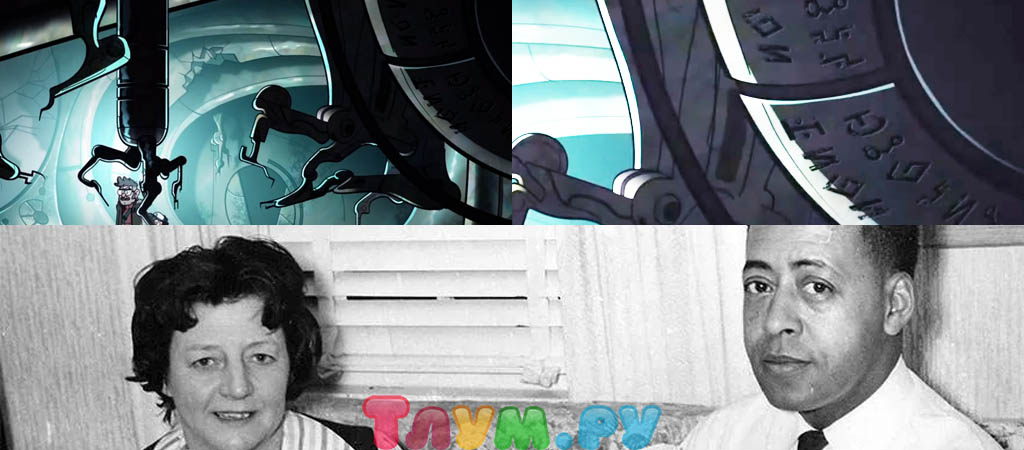 Вот, к примеру, отличный пример того, как персонажи «уводят» за собой взгляд зрителей и лишь самые внимательные (или пересмотревшие каждый эпизод не один раз) смогут заметить. Что заметить? Надпись! 2 сезон, 17 серия: Диппер и Форд находятся в инопланетном бункере. Нажимаем паузу, высветляем, переводим и получаем фразу «Здесь быть Бетти и Барни». Это реальные супруги Хилл, утверждавшие, что 19 сентября 1961 года их похитили инопланетяне.