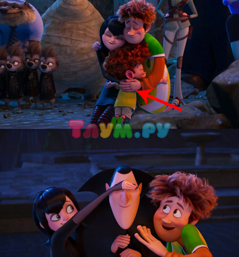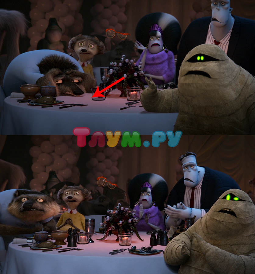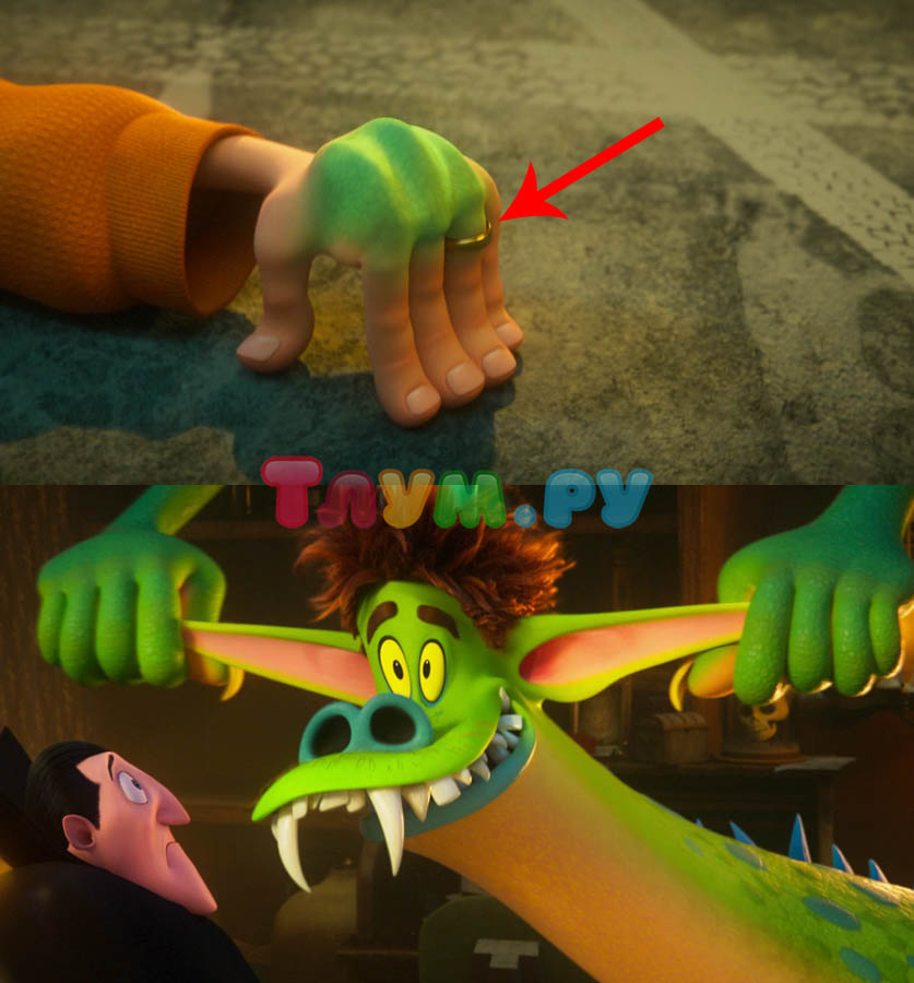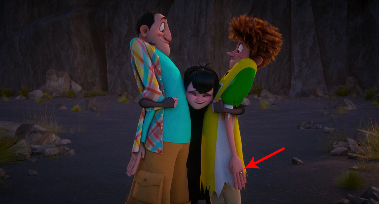 Завершаем подборку ляпов тем самым — возвращаемся к обручальному кольцу Джонни. Разница между кадрами целый год. А кольцо так и не на месте. Но… Есть это любимое нами «но», кольцо после размонстрячивания возвращается ровно на одну сцену — в которой Джонни, Мэйвис и Дракула дружно и по-семейному обнимаются. Появляется кольцо и пропадает. Всё загадочно.