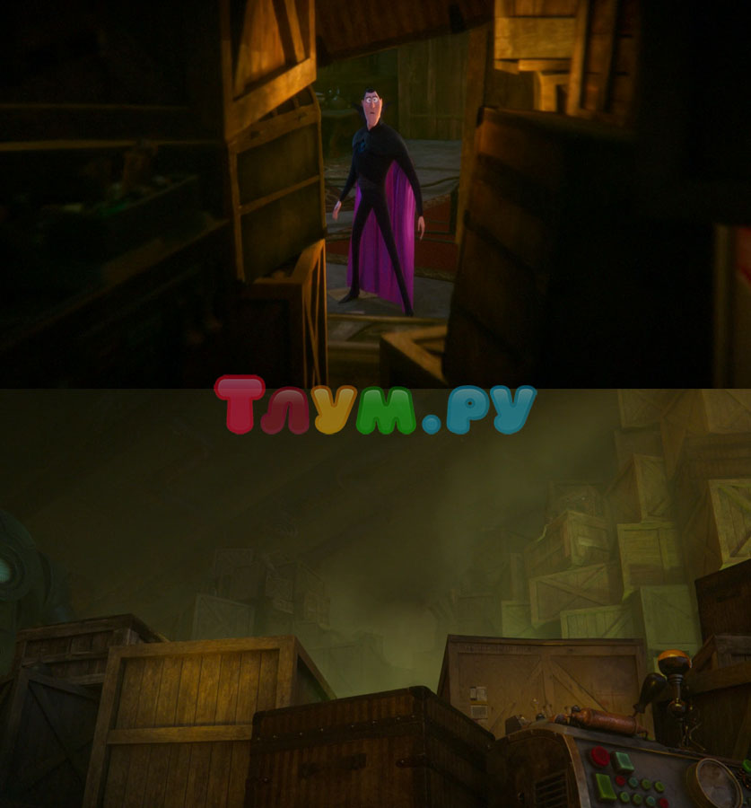 Нам показывают, как омонстрившийся Джонни явно выглядывает на Дракулу, виднеющегося между коробок. В итоге эффектный кадр заканчивается грустно — Джонни вылезает из-за целой горы коробок и ящиков. Не дотянули, ох, не дотянули!