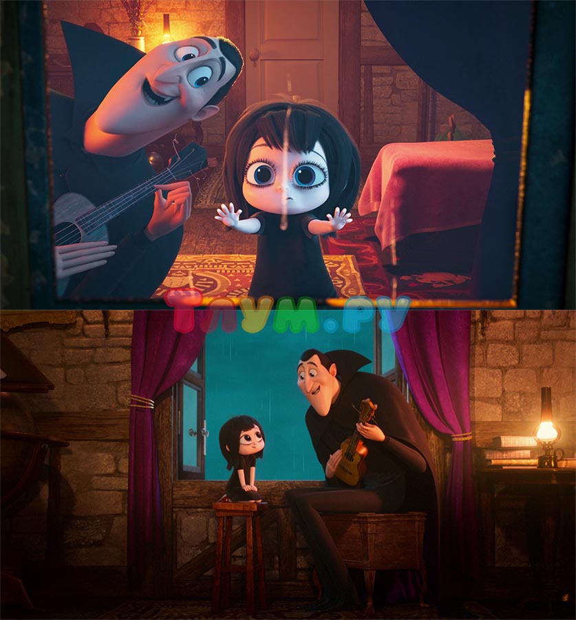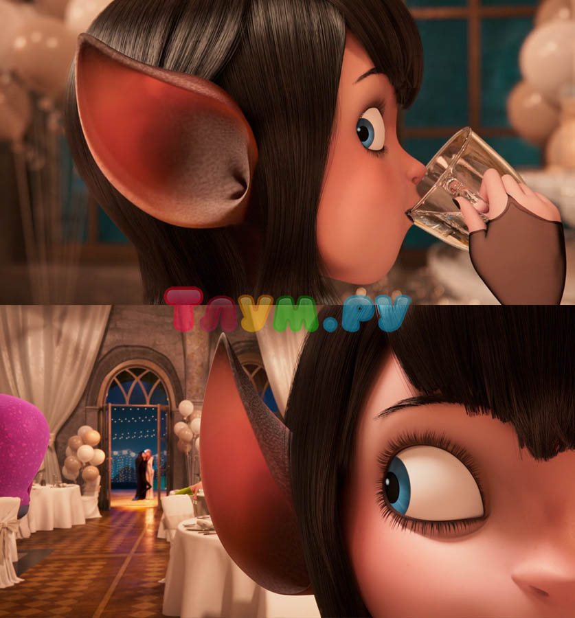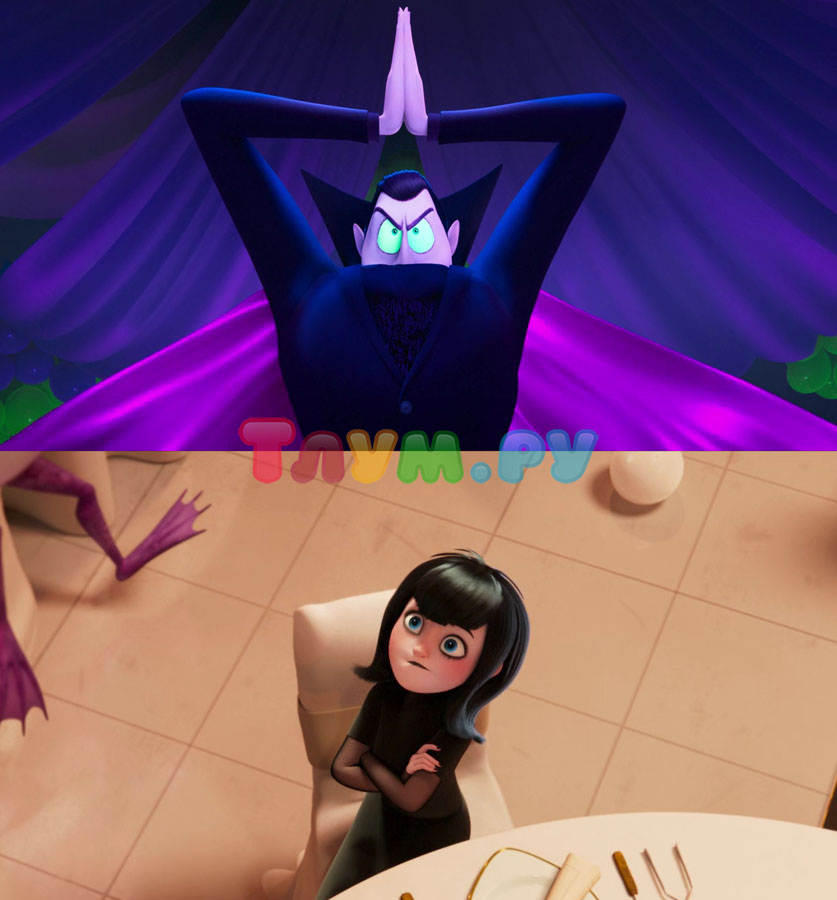 По идее волшебный гипноз Дракулы, как он сам и говорит, не должен влиять на Мэйвис — она тоже вампирша. Точно? Если вспомнить предыдущие части, дочка успешно попадала под заклятие. Видимо, выработала устойчивость, когда оценила, сколько раз папа пользовался подобным приёмом в неугодных ему обстоятельствах.