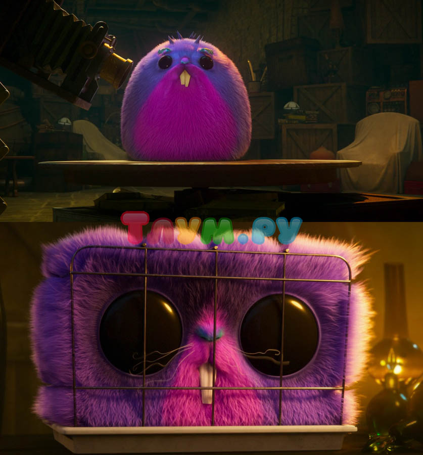 На общем плане видно, как позади Дракулы и Мэйвис сидит некто фиолетовый. Джонни устраивает мини-шоу, проходит где-то минута. Оказывается, не фиолетовый там монстр, а зелёный.