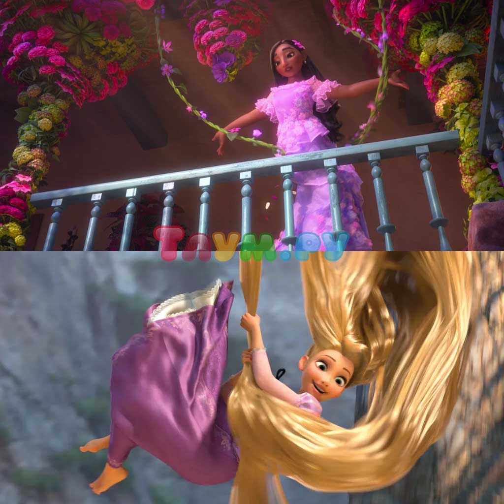 Драматичный и эффектный спуск Исабеллы со второго этажа покорил всех, кроме Мирабель. Нас он, к примеру, и покорил, и заинтересовал. Слишком уж напоминает сцену со златовласой Рапунцель, она на своих волосах тоже как на качелях успела прокатиться.