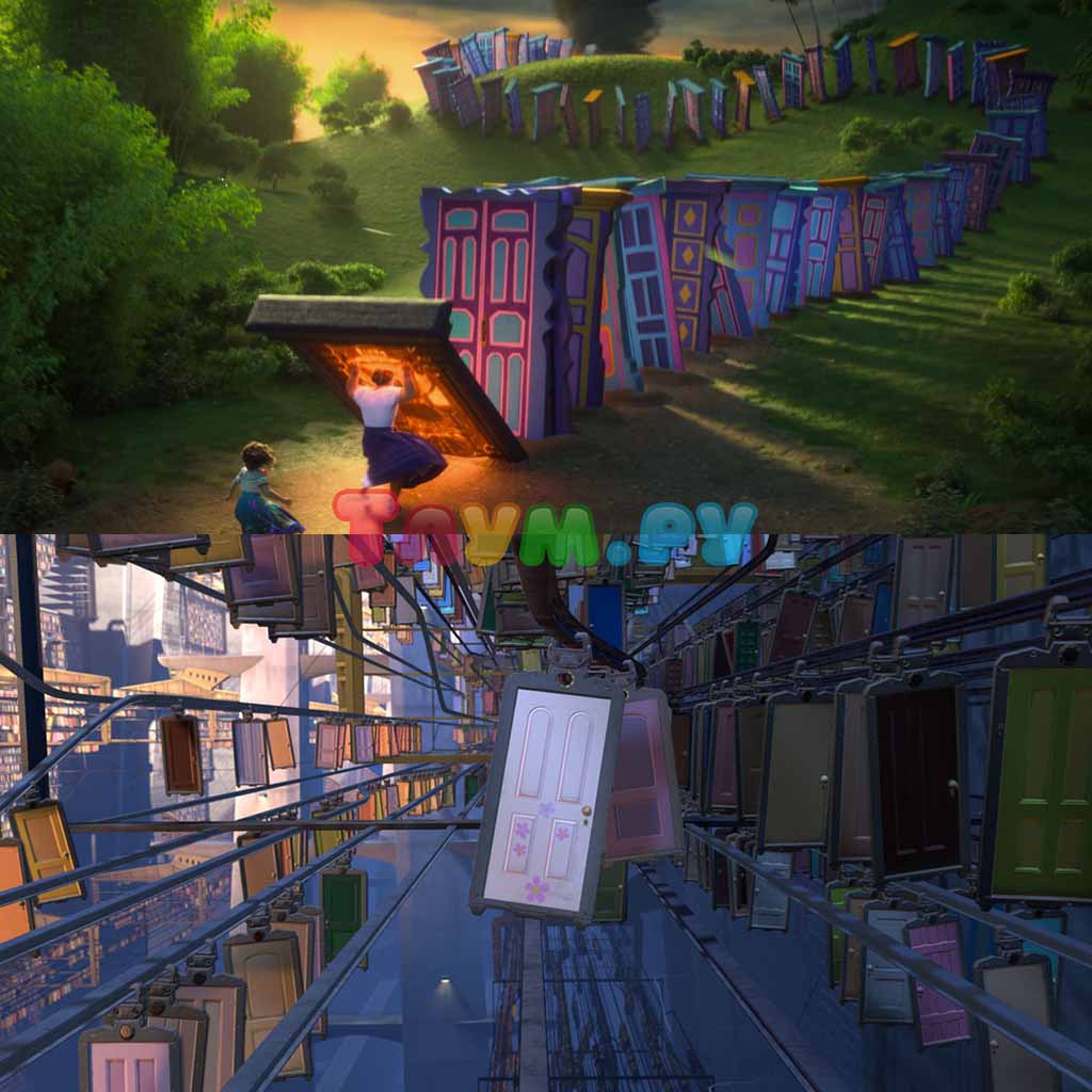 Классику жанра — «Корпорацию монстров» — сложно забыть, да и не надо. Проще элегантно о ней напомнить, вот уж где в дверях (разного количества и качества) отбоя не было. Там они не волшебные, что даже в плюс, Майк и Салли и с одной-то Бу едва справились!