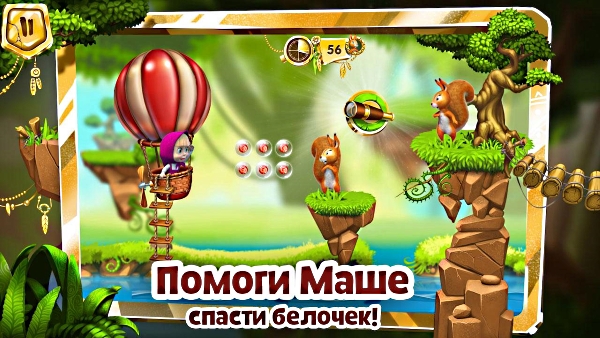 Маша из мультфильма «Маша и Медведь» путешествует по волшебному лесу на воздушном шаре, собирает конфетки и подбирает белочек, застрявших на островах. Управление одной кнопкой, невозможность «погибнуть» делают игру привлекательной для самых маленьких пользователей.