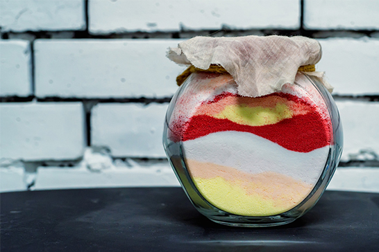Для начала вам нужно развести пищевой краситель водой. Разложите нужное для поделки количество песка по разным контейнерам, залейте смесью и тщательно перемешайте. Вы получите несколько емкостей с разноцветным песком. Когда он просохнет, можно начинать творить. Возьмите бутылку и положите в нее первый цветной слой. Все последующие слои нужно насыпать очень аккуратно, а бутылка должна быть неподвижна, чтобы слои не смешались. Встряхивать ее нельзя.