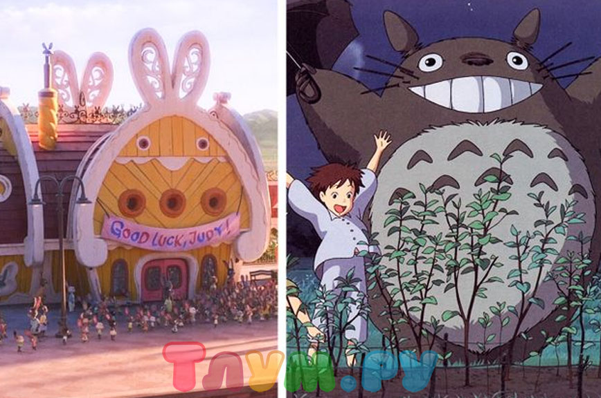 Дом родителей Джуди из «Зверополиса» сделан в форме кролика, но многие фанаты заметили, что он похож на милого Тоторо из мультфильма Хаяо Миядзаки «Мой сосед Тоторо». А как вам кажется, есть сходство?