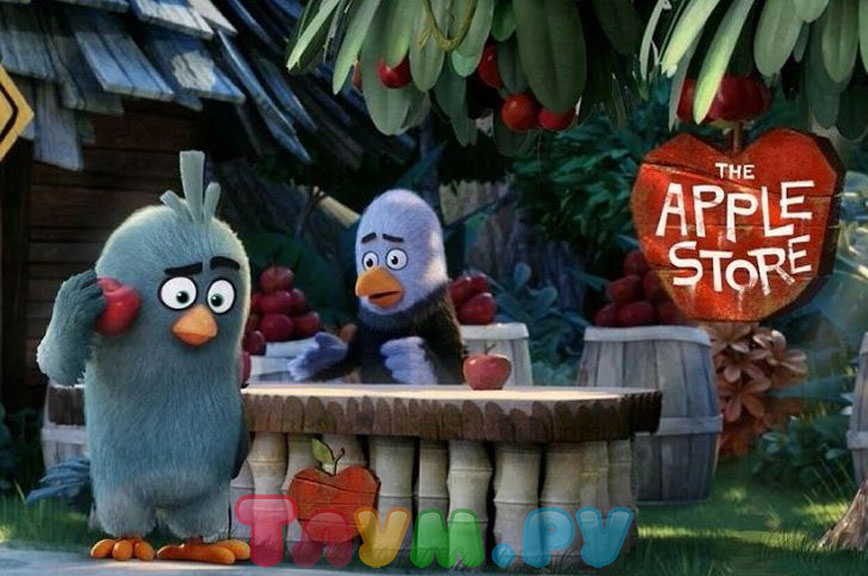 Герои мультфильма «Angry Birds в кино» живут в любопытном мире, чем-то похожем на наш, но всё-таки более природном и естественном. Так, у них есть свой магазин Apple Store, и продают там буквально яблоки. Что не мешает некоторым пытаться по ним позвонить.