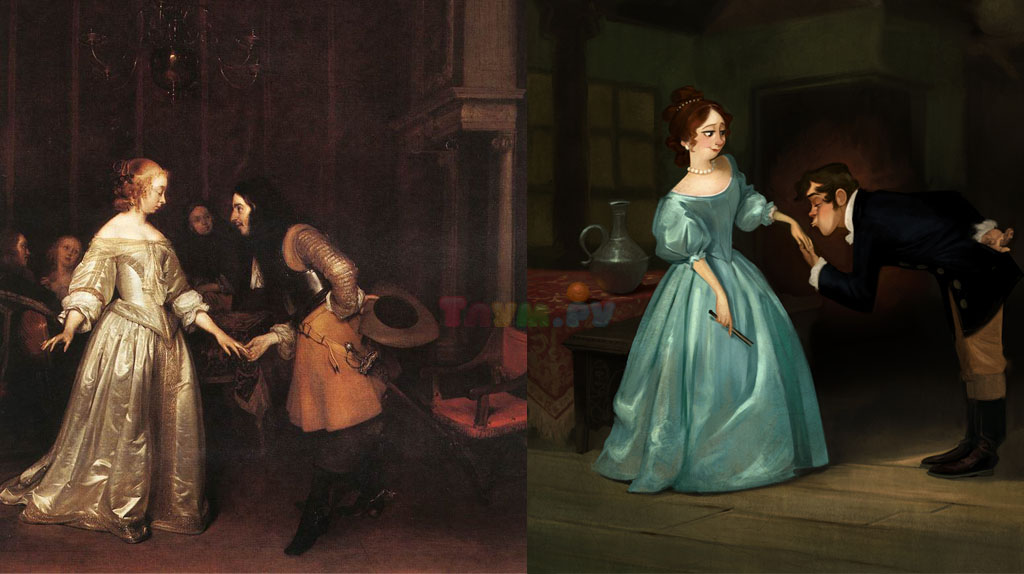 И последняя картина — полотно Герарда Терборха «Танцующая Пара», которая несомненно является отсылкой на сюжет мультфильма. Модный кавалер в военной форме — это, разумеется, принц Ханс. А застенчивая девушка, которую он приглашает на танец — это Анна.