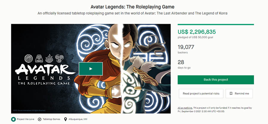 Для создания официальной настольной ролевой игры «Avatar Legends» была запущена кампания на сайте Kickstarter, где каждый проект имеет шанс найти необходимое финансирование. За разработку игры взялась фирма «Magpie Games».