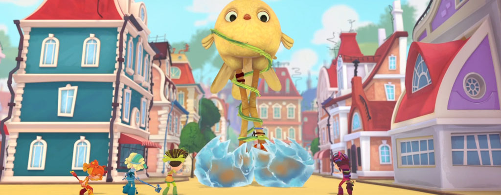 В этот раз волшебницы стараются обуздать огромного… цыплёнка. Рано или поздно они победят, пусть даже ноги создания такие длинные и могучие, что у девочек не хватает сил его догнать. А когда птенчик оказывается окольцован лианами и останавливается из-за льда на лапах, в кадре появляется Баба Яга.