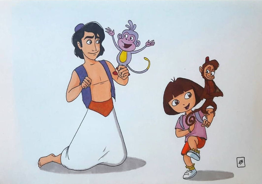 Художница из Франции Линда Будебала подумала об этом и опубликовала в своем [данные удалены] иллюстрации на тему обмена питомцами. Смотрим и удивляемся тому, как же мы раньше не думали, насколько круто будет смотреться Покахонтас и Ракета вместе!