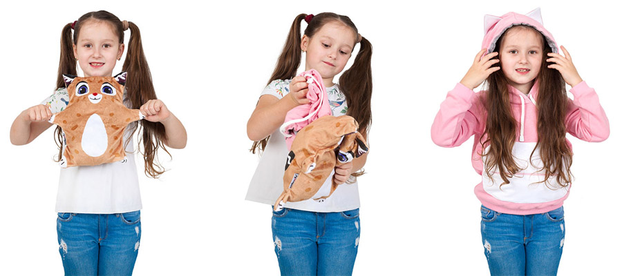 Она может быть мягкой игрушкой, с радостью станет не менее мягкой подушкой (к примеру, в путешествиях), и самое главное — всегда поможет вашему ребёнку согреться. Нежный розовый цвет толстовки понравится многим девочкам.