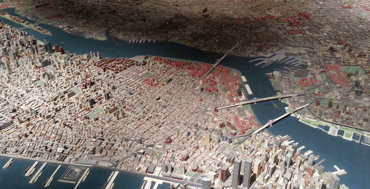 Редкая возможность взглянуть на небоскребы свысока предоставляется в Музее Квинса в Нью-Йорке. Здесь можно «пробежаться» по всем пяти районам города возможностей, включая Манхэттен, и увидеть 895 000 зданий в масштабе 1:1200. Первые здания начали создаваться в 1939 году, в 1964 году макет был достроен к Всемирной выставке, после чего не раз обновлялся и дорабатывался, сейчас он занимает площадь 867 м2. Уникальность макета состоит в том, что квартиры и дома продаются посетителям: заплатив от $ 50 до $ 1000? вы можете приобрести склад, пирс, офис или жилой дом и тем самым помочь музею.