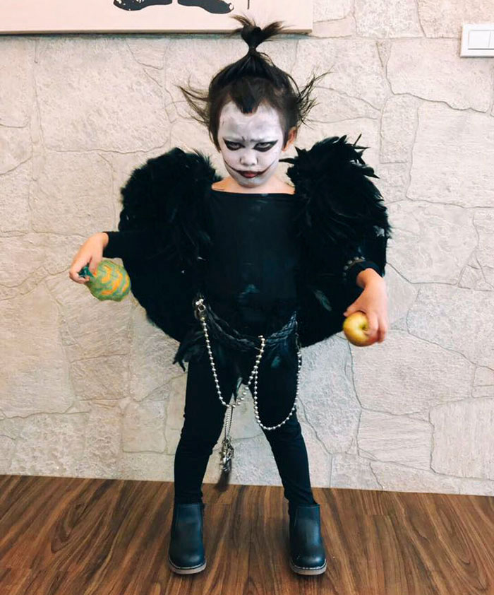 В этом году девочка снова нарядилась персонажем японского мультфильма — на этот раз она стала Рюком, богом смерти из популярнейшего аниме «Тетрадь смерти».