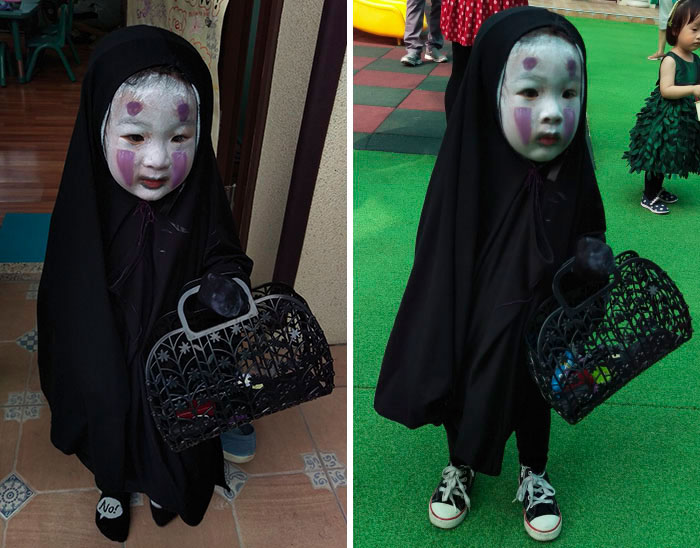 В прошлом году она была Безликим из «Унесенных призраками» Хаяо Миядзаки. «Когда Момо вошла в группу, никто ее не узнал. Ее друзья начали плакать», — вспоминает мама девочки. «После садика мы обошли магазины и ушли домой с корзиной, наполненной конфетами».
