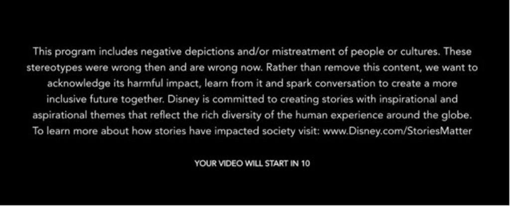 Такие мультфильмы, как «Леди и Бродяга», «Дамбо», «Книга джунглей» и другие классические диснеевские картины содержат устаревшие представления об обществе и отдельных его группах, например, афроамериканцах. И так как переснять или вырезать некоторые моменты невозможно (в этом несомненный плюс ремейков студии — они показывают больше разнообразия и меньше стереотипов), руководству Disney остаётся добавлять дисклеймеры: