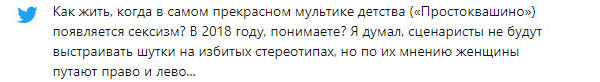 О времена, о нравы! На днях вышла вторая серия нового «Простоквашино», и студии «Союзмультфильм» снова прилетело от взрослых. Главными претензиями, кроме достаточно конструктивного «звук не совпадает с движениями губ», стали два следующих момента: сексизм (из-за шутки про «женский навигатор») и эксплуатация детского труда (для выработки электричества задействовали Веру Павловну в колесе). Да, настолько громко: