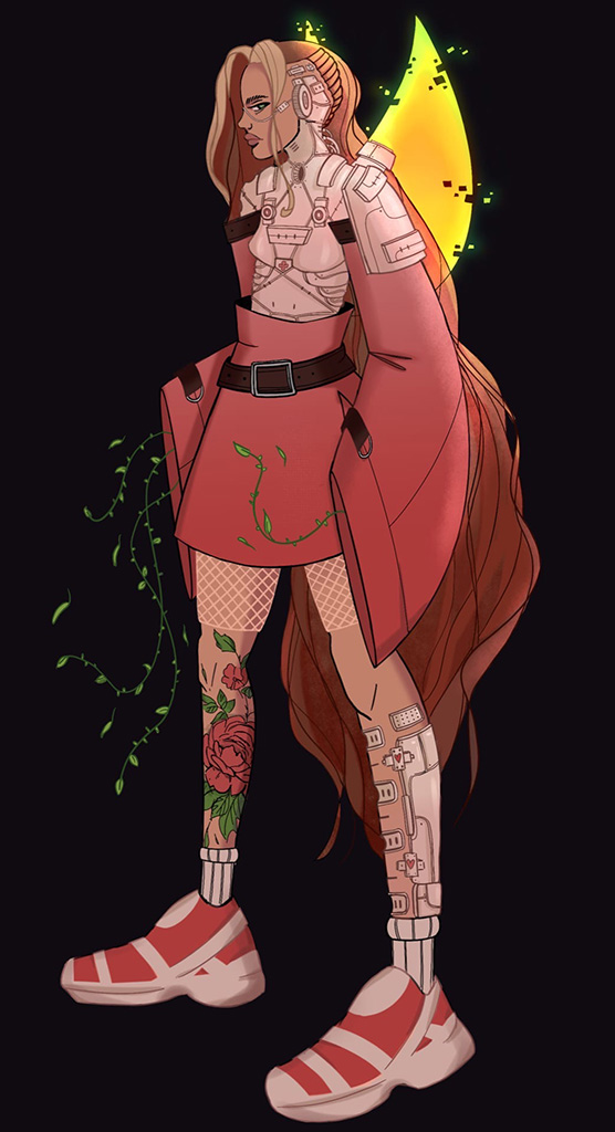 Флора может показать не только красивую татуировку на ноге, но и чудо техники на другой (да и не только на ноге). Посмотрите как следует на причёску феи — такую захочется сделать даже за пределами киберпанка.