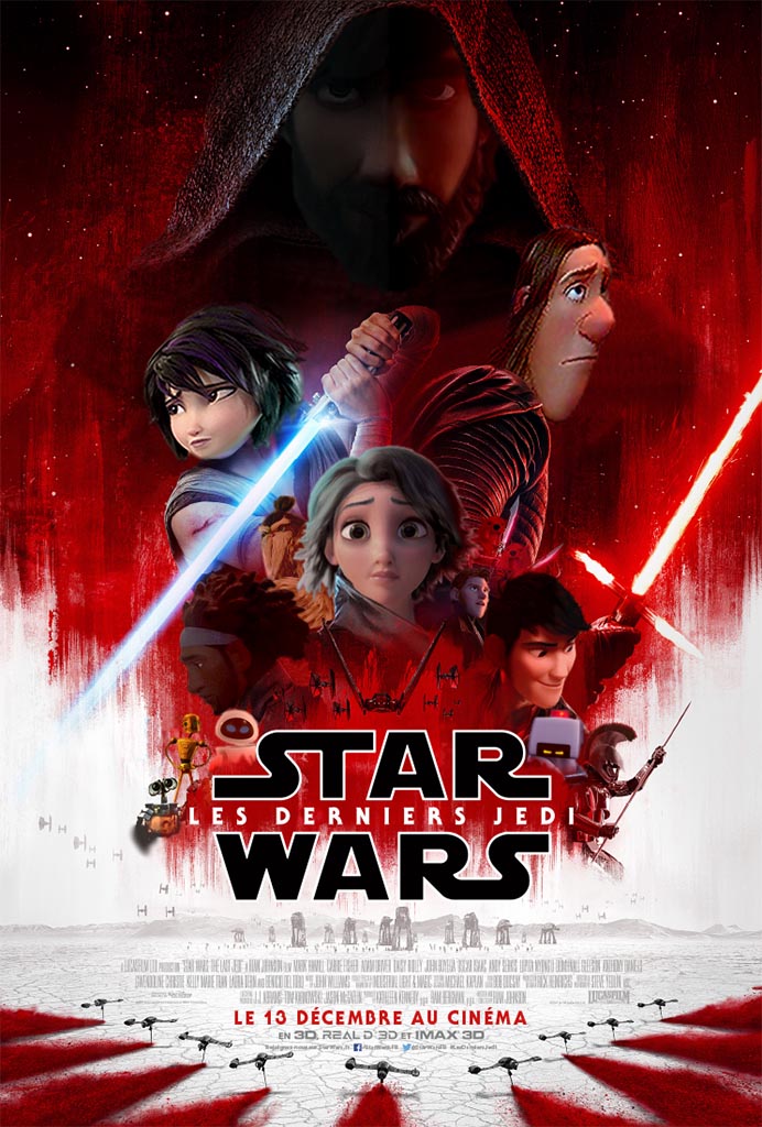 На этом стилизованном постере фильма «Звёздные войны: Последний джедай» засветились: Взрослый Иккинг («Как приручить дракона») — Люк Скайуокер, Рапунцель — Лея Органа, Ханс («Холодное сердце») — Хакс, ГоГо Томаго — Рей, Фред — Кайло Рен, Тадаши Хамада — По Дэмерон, Васаби — Финн (все из «Города героев») , ВАЛЛ-И — R2D2, ЕВА — BB8, M-O — BB9-E (все из «ВАЛЛ-И»). И Карл — C3PO («В гости к Робинсонам»).