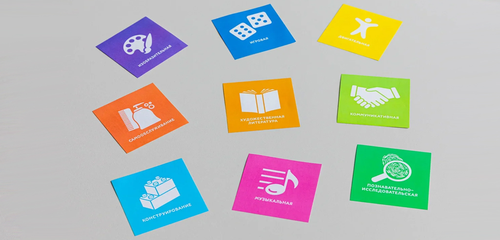 Так называемая методичка «Простоквашино» оформлена в виде посылки (привет, почтальон Печкин!). Начинается занятие с того, что дети выбирают для себя один из 9 видов деятельности: игровая, музыкальная, коммуникативная, познавательно-исследовательская, изобразительная, конструирование, двигательная, самообслуживание, чтение художественной литературы.