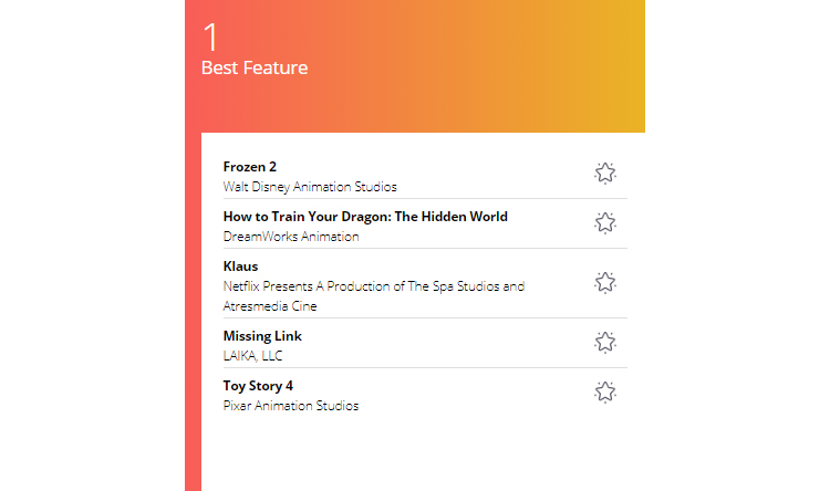 «Дитя погоды» находится в гонке за 4 наградами, как и «Эверест». «Тайная жизнь домашних животных 2» претендует на 2 приза. «Как приручить дракона 3», «История игрушек 4» и фестивальный мультфильм «Я потерял своё тело» выдвинуты на 6 наград. В категории «Лучший фильм» представлены все 5 самых «горячих» мультфильма года, а, значит, придётся серьёзно думать, прежде, чем проголосовать.