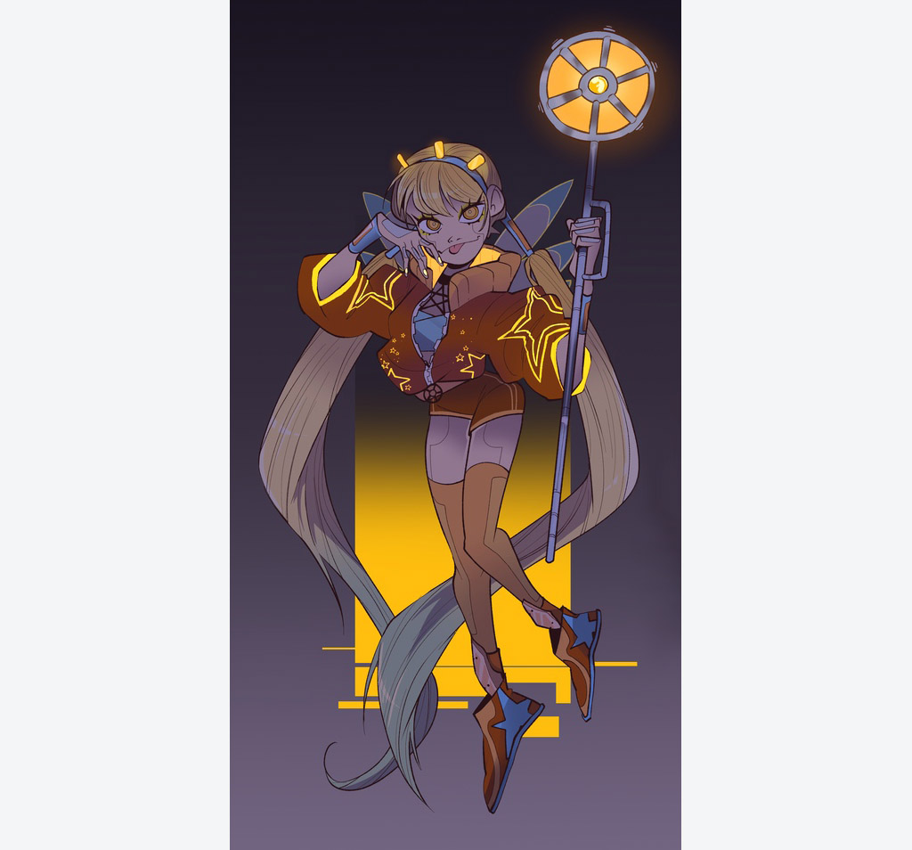 В образ Стеллы вписаны яркие звёзды — девушка одновременно яркая и технологичная